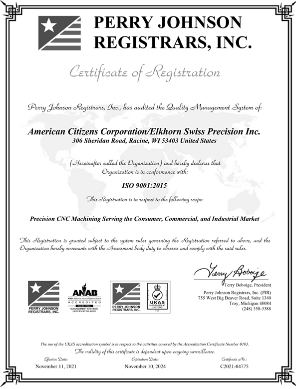 through teamwork, education, communication and consistency of all Elkhorn Swiss Precision, Inc. employees and products.